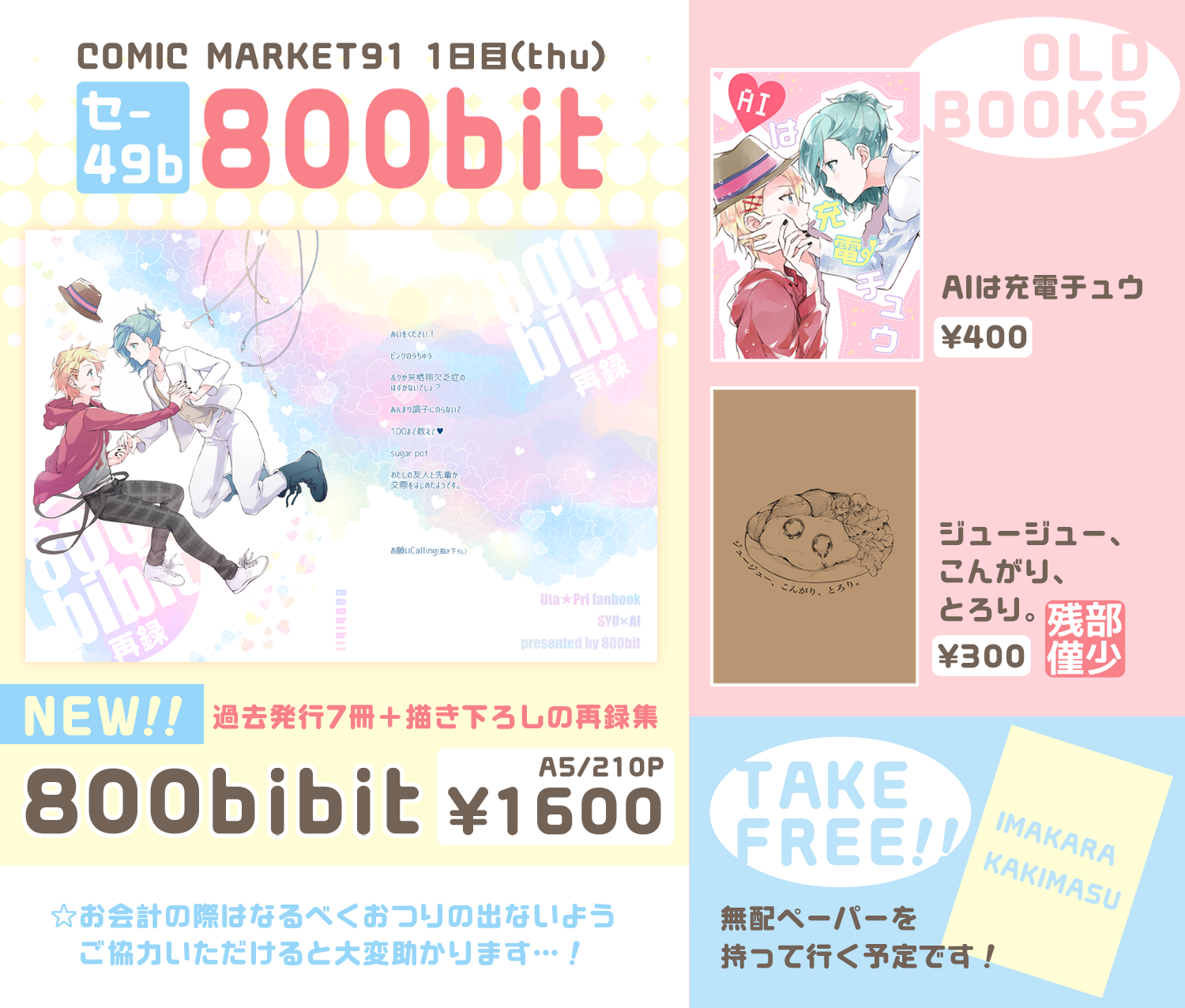 本年1発目!参加イベント情報などなど 未選択 2017年01月14日 明けていましたおめでとうございます! 新年始まってもう2週間で、ご挨拶遅れましたが今年もよろしくお願いします。 マイペースながら…といつも言ってきましたが、今年はもう少し精力的に! ごりごり!描いて!ごりごり!成長したいです。 ◆冬コミありがとうございました! 前回の冬コミではスペースお越し頂いた方々ありがとうございました…! 寒い中わざわざ足を運んで頂き、本をお手に取って頂けること本当に恐縮です… 再録集は実物を見たときは厚みとホログラムPPの美しさに感激しました! きれいに刷れていて本当に良かったです…! 昼頃になってビックサイトの屋根の隙間から大陽の光が差し込んだときに 机に並べた再録の表紙がキラキラ光って水面のごとくだったのがね… めちゃくちゃきれいだったのですよ…(素面) 頑張って作って本当に良かったと思いました…><。 お手に取って頂き、拙い漫画ですがお目通し頂いた方々ありがとうございました…! 感想までくださった方も貴重なお時間割いて頂いて本当に有り難いです。 これからも自分の好きなものをかたちにしていけたら良いなと思います。 ◆新刊/在庫情報 今回の冬コミで既刊の「ジュージュー、こんがり、とろり。」が完売致しました。 お手に取ってくださった方々ありがとうございました! 翔藍がどう見ても付き合ってるとしか思えない伝説のハムエッグエピソード…! 何かしら作品にしたいと思ってたのでこの本を描きました。 末永くお手元に置いて頂ければ幸いです。 通販は現在とらのあなさんにて「800bibit(再録集)」「AIは充電チュウ」が取り扱い中です。 追加納品の予定はありませんので、通販で入手されたい方はお早めにどうぞ… 以下から通販ページに飛べます。 【とらのあな様 800bit作品一覧 】 またとらのあなさんの店舗にも少しずつ振り分けて入荷されてるようです。 以下のページから店舗ごとの在庫も確認できますので、 店頭で入手されたい方は以下のページご参照ください。 【とらのあな様 800bit店舗在庫】 ★次回参加イベント情報 次回参加予定のイベントは2/12(日)プリ☆コン7になります。 新刊はHARUコミ発行予定の新刊の準備号になる予定です。 準備号の頒布価格などは未定ですが、 HARUの新刊購入時にお値引きできるチケットをつけて頒布する予定です。 なんか準備不足で「未定」とか「予定」ばっかりですが、 確定し次第またお知らせさせていただきますのでよろしくお願いします〜!