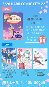 春コミのお知らせ! 未選択 2017年03月19日 春コミのお知らせに参りました〜! 春コミスペースは 東6ホール 東や-18b 800bit です。 今回は西にも東にも同じ記号のスペースがあるらしいので 「東」や…となってるらしいですね…! とにかく東6ホールにあるや-18bを目指してきて頂ければ問題ないはずです…! ◆新刊情報◆ 今回の新刊は「酔っ払った翔くんを介抱する藍ちゃん」がテーマです。 1月にツイッターにて酔っ払った翔くんネタで漫画を描いたのですが、 その流れで酔っ払った翔くんをもうちょっと描きたいな〜と思ったのがきっかけです。 「完熟 桃酔いの月」B5/32P/¥500- お酒の缶型の本にしたくて四つ角を切り落とす加工をしました! 缶みたいに見えてると良いです〜! 裏もこだわってるのでぜひ実物でご覧ください 中身はクリーム色の紙にしたので暖かみが出てるといいな…。 そんな感じで、いつもは装丁にあまりこだわらないのですが、 今回はガッツリと!装丁に手を加えましたので、 わたしも出来上がりが楽しみです…! こちらの本はとらのあなさんで通販&店頭販売されます。 ご利用の方は以下よりお願いします。 【とらのあな通販ページ】 あとは、当日はせっかくだしスペースもお酒売り場みたいに出来たらいいな… と思ったので、ポスターも描き下ろしました! 居酒屋に飾ってあるような広告ポスターをイメージしました。 キャッチコピーを考えるのが楽しかったです スペースもなんとなくスーパーの新発売の商品ディスプレイみたいな感じでに 出来ればいいなと思って色々やってみようと思いますので、 足を運んで頂いた際には少し見てやって下さい… 既刊も3種類持っていきます。 詳しくは以下のお品書きを参照ください〜! 以上になります! 春コミお会いできる方々はよろしくお願いします 春を満喫しましょう〜